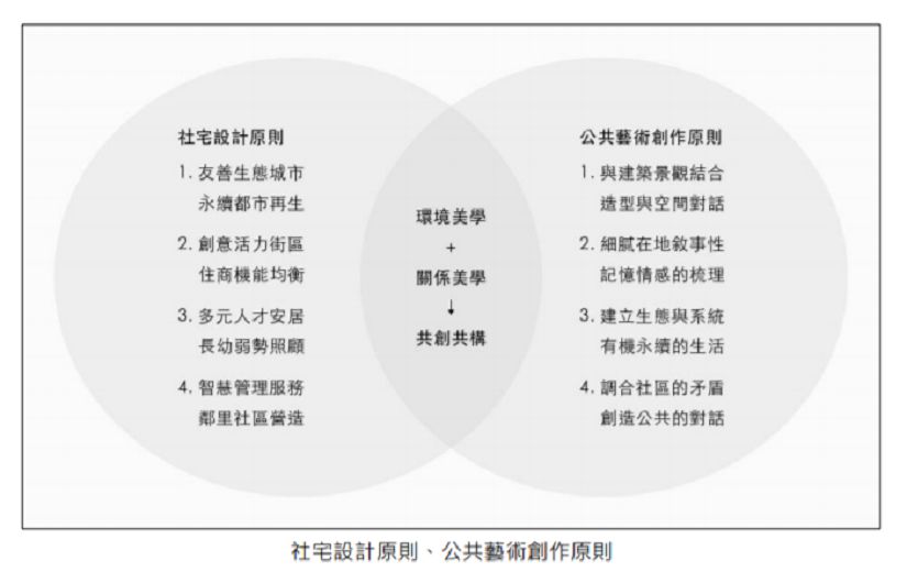 由文化部與各地方政府攜手推動的「社會住宅公共藝術設置計畫」裡面除了原有的「公共藝術作品設置」內容之外,更加入了「藝術社會工程」項目,用意就是希望透過民眾參與計畫、藝術進駐計畫、社會設計等讓「居住」這項生活基本需求除了得到滿足之外,能因為藝術的參與讓入住者和周邊住民可以透過「共感」產生凝聚力,自在且安適的將自己視作社區的重要一員。