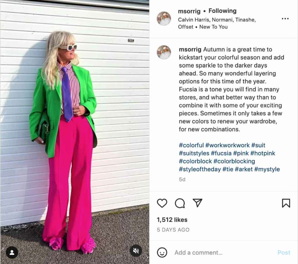 來自丹麥的Mette Sørrig Andersen總是帶著笑,她的IG帳號中看不到沉悶的顏色,是筆者很喜歡的銀髮網紅。她的風格很適合有點個性、喜歡亮色穿搭又擔心拿捏失準的朋友參考。身為數位設計師的Mette對色彩的運用有獨特的天份,擅長用亮色的單品與飾品搭配服裝來凸顯個人特色。即使是年輕族群也不敢輕易嘗試的螢光色系,在她身上穿起來卻有型得恰如其分,從她的IG裡也不難發現她對生活的熱愛。