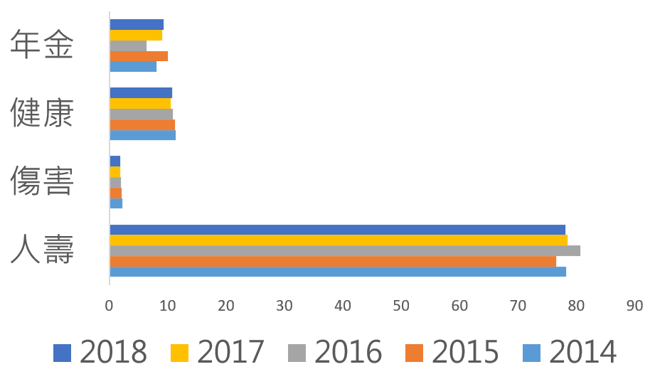 根據財團法人保險事業發展中心的數據顯示,若只看個人險的部分,人壽保險的總保費收入佔的比例從2014至2018年都佔了75%以上,在2016年還達到了80.64%。接著是健康險的11.36-10.55%不等,年金險的10.06-6.39%不等 ,最少的是傷害險的 2.21-1.86%不等。其中壽險的部分,還包含了大家孰悉的儲蓄險,換言之,大家買的保險基本上都不是在幫大家身前做保障,而是在處理身後的保障。也怪不得,金管會在2019年要求保險業者要改善儲蓄險的部分,避免資金進到保險業者,但民眾卻沒有實質受到保險的保障。