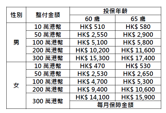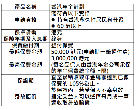 例如一位60歲男士(最低申請年齡)開始購入100萬港幣(最大金額可到300萬)政府年金,每月可收取HK$5,100固定年金按估計的最高內部回報率計算;年金公司會保證支付不少於204個月(17年),總額約等104萬的年金(年利率約0.3%),在17年後仍可每月繼續領取HK$5,100直至百年歸老,為穩定退休收入。