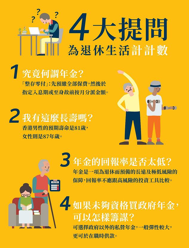 高齡化社會面臨的重大挑戰,就是如何確保退休人士有足夠收入或財力以安享晚年。不少政府推出各式各樣「隨收隨付」(pay-as-you-go)退休保障計劃,同樣,香港政府於2018年推出「老人年金」整存零付保險產品,投保人先將全部保費整筆付款,再按月分派金額,金額視投保人性別、年齡及投保多寡而定。政府年金將保證收取的累積保證每月年金金額,不少於已繳保費的105%。當保證期過後,可終身獲發每月定額年金金額直到身故為止,換言之,愈長壽所得到的累積金額便愈多。