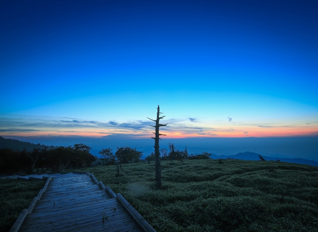 微熹天光,山間霧氣茫茫,帶著幽微晨光的水氣沁透正在埋頭往上爬行的一群人身上,混著汗水與人體呼出來的熱氣形成熱呼呼的獨特氣息散在山間步道上。
